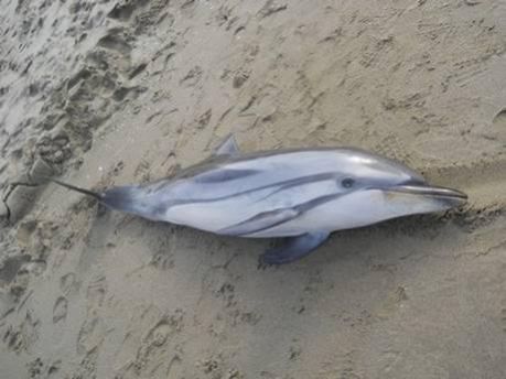 Delfino morto ad Antignano. La carcassa era in stato di decomposizione e questo lascia supporre che il cetaceo fosse morto da tempo.