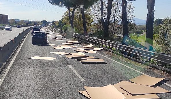 Una lunga scia di cartoni, per centinaia di metri, ha costretto gli automobilisti ad utilizzare la sola corsia di sorpasso.
