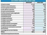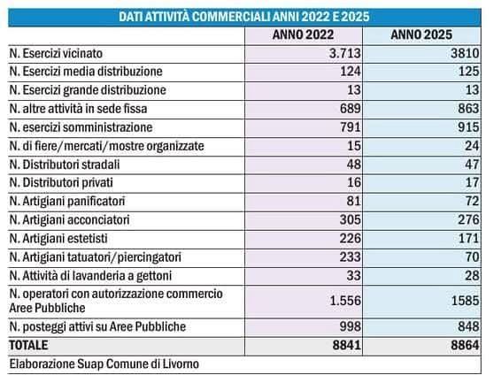 "I dati ufficiali dell'ufficio Suap (Sportello Unico per le Attività produttive) sono chiari, Livorno sul fronte delle attività commerciali attive in città è in controtendenza con il resto delle grandi città toscane e italiane. - dichiara il sindaco - Nel 2022 le attività aperte erano 8841 nel 2025 dopo 4 anni il numero di realtà aperte è di 8864. Un +23 che ci dice chiaramente che siamo di fronte ad un quadro di sostanziale tenuta del tessuto commerciale se non addirittura di incremento".