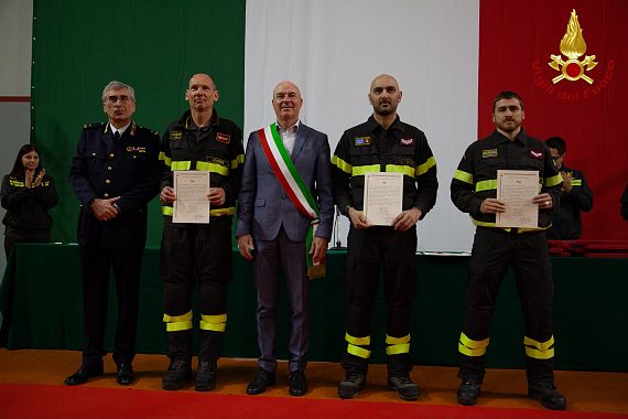 Nella motivazione si legge: "Liberi dal turno dopo aver raggiunto con grandi difficoltà il Distaccamento di Portoferraio, traevano in salvo con una barella improvvisata una donna bloccata per una frattura al bacino sul letto già raggiunto dall’acqua ed effettuando successivamente il salvataggio di una coppia di coniugi rimasti bloccati all’interno di un appartamento allagato ad un metro e mezzo di acqua".