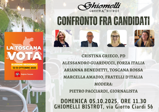 LIVORNO — Un confronto elettorale tra candidati in vista delle elezioni regionalo si terrà domenica 5 Ottobre alle ore 11,30 presso il Ghiomelli Bistrot, in via Giotto Ciardi 56, a Livorno.