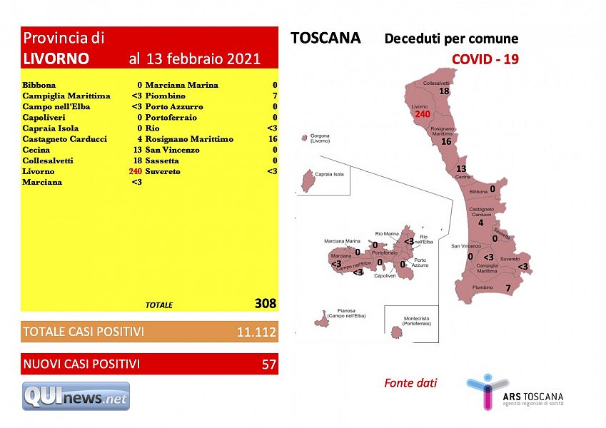 I contagi totali da inizio emergenza sul territorio labronico diventano dunque 11112. Nella giornata di oggi non vengono segnalati decessi, che restano dunque 308.