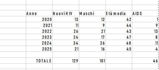 Un dato che si inserisce in un quadro più ampio: dal 2020 a oggi, le nuove diagnosi complessive sono state 129. I numeri sono stati presentati in vista della Giornata Mondiale contro l’Aids del 1 dicembre, appuntamento che ogni anno richiama l’attenzione su un tema che continua a richiedere consapevolezza e prevenzione.