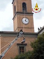 LIVORNO — A Livorno la Befana, oggi pomeriggio verso le 15 e 39 è apparsa sul campanile del Duomo e grazie, all'aiuto del nucleo specializzato in tecniche di soccorso speleo alpino fluviale dei vigili del fuoco, si è calata giù a terra attraverso una teleferica.