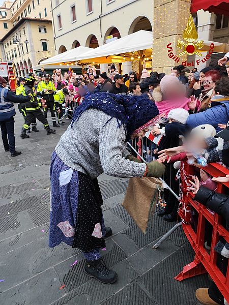 La Befana, impersonata da un vigile del fuoco, è così atterrata sulla piazza sottostante al campanile per la gioia dei più piccoli.